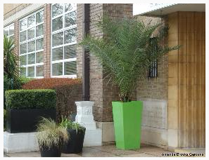 We used Phoenix canariensis in fabulous bright green pots, agapanthus and grasses in round black pots and an ‘instant’ box hedge on either side to finish off the look. The plants are all robust and can cope with a bit of a struggle – aspect is due south so they will be blasted by the sun, but that’s fine. The pots are all ‘top dressed’ with black pebbles not only to look good but to help retain moisture. Watering once or twice a week and a gentle clip of the box hedges as they grow is about all the maintenance required.